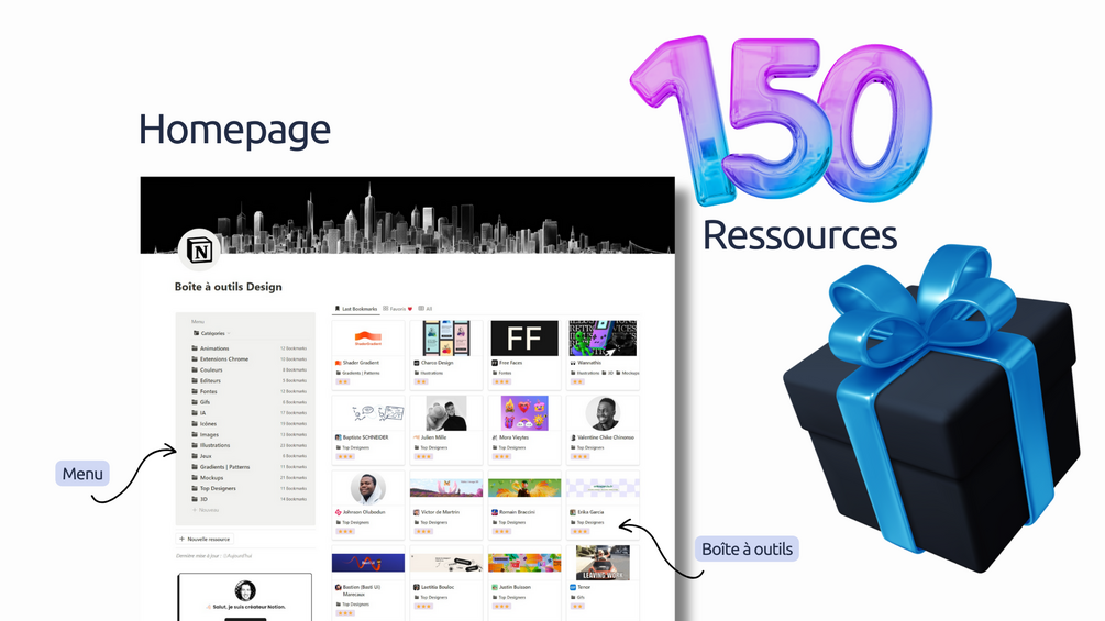 Profitez dès maintenant de cette base Notion pour structurer et enrichir votre veille créative. Boostez votre productivité et laissez libre cours à votre créativité avec 150 ressources Design!