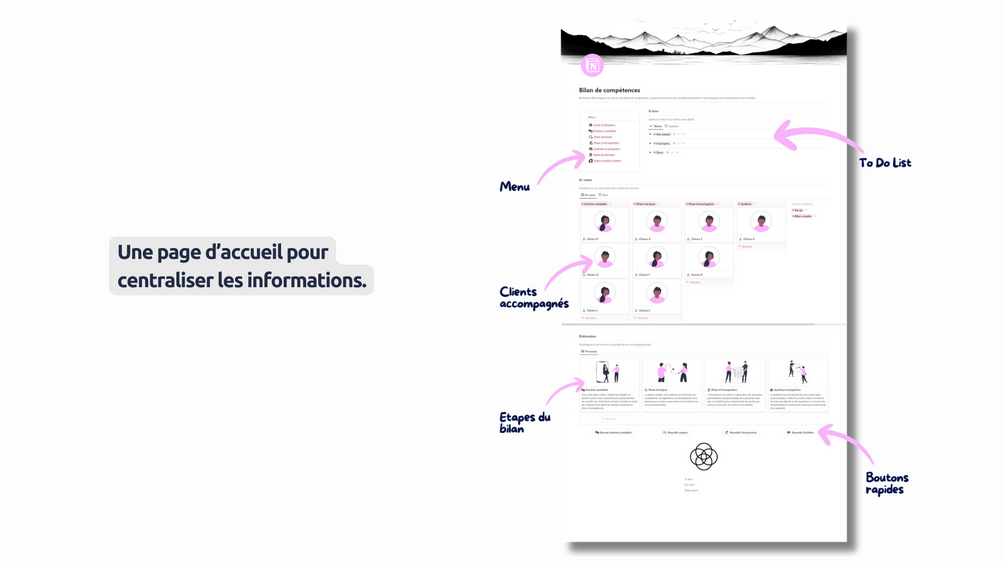 - Des templates pour les étapes du bilan, les fiches clients et les suivis de progression.