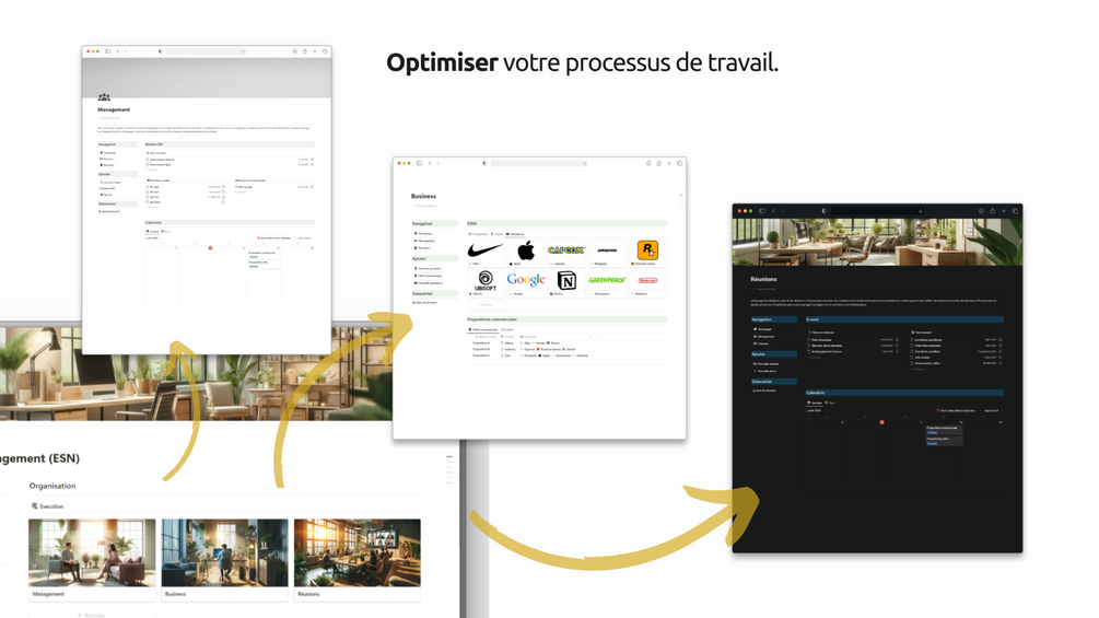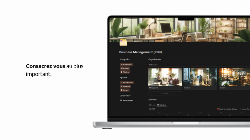 - Consacrer votre temps à l'essentiel : Segmentation claire de vos tâches quotidiennes en trois sous-pages dédiées : Business, Management, Réunions.