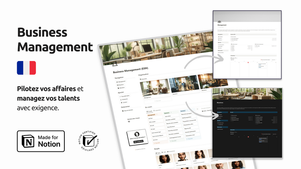 • 3 sous-pages dĂ©diĂ©es : Business, Management, RĂ©unions. Chaque sous-page est conçue pour segmenter au mieux vos tâches et responsabilitĂ©s.
