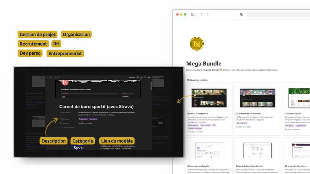 Accédez à l'intégralité de mes modèles Notion regroupés dans cette offre unique. Ce Mega Bundle est la solution idéale pour optimiser votre organisation, vos projets, vos ressources humaines et votre développement personnel. Chaque modèle est soigneusement conçu pour répondre à vos besoins spécifiques et améliorer votre efficacité.