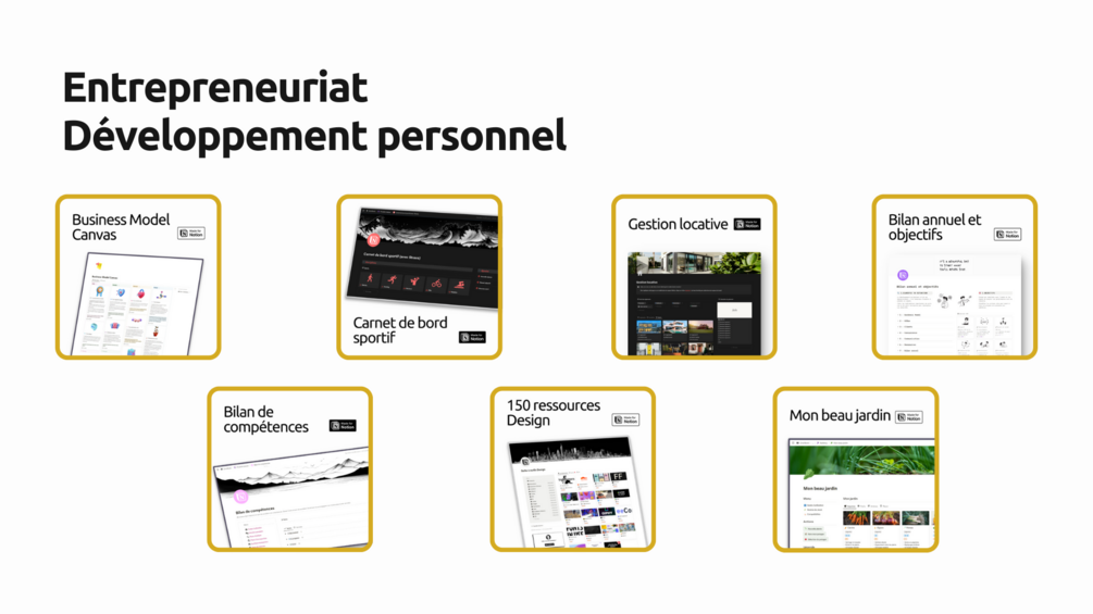 Concernant l'entrepreneuriat et le développement personnel, vous trouverez des modèles pour ceux qui cherchent à améliorer leur productivité, à développer leur business, ou à travailler sur leur croissance personnelle. Chaque modèle est conçu pour vous aider à structurer vos idées, suivre vos progrès et atteindre vos objectifs.