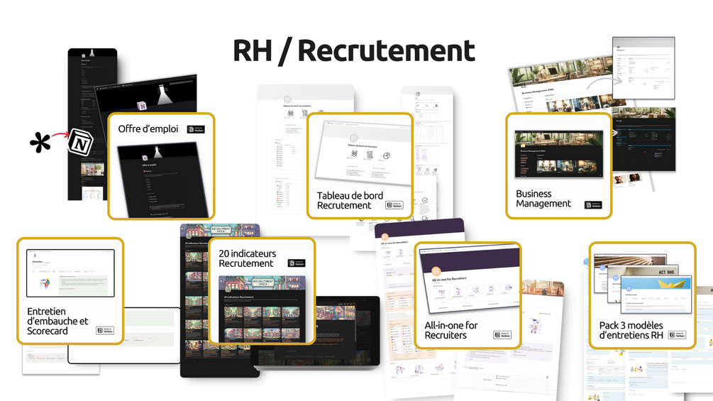 Les modèles RH et Recrutement sont prévus pour les professionnels des ressources humaines et les recruteurs. Ils vous aident à gérer efficacement vos offres d'emploi, à suivre vos recrutements et à évaluer vos performances. Simplifiez et optimisez vos processus RH avec ces outils complets.