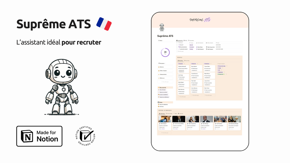 Optimisez vos processus de recrutement avec un ATS moderne, flexible et économique conçu sur Notion. Bénéficiez d'un outil complet qui rivalise avec les solutions traditionnelles du marché.